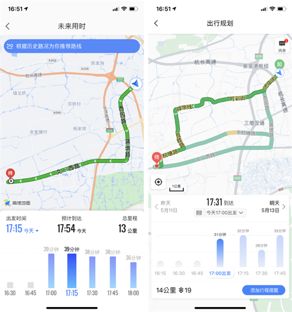 高德地图(左)和百度地图(右)的未来用时和出行规划功能