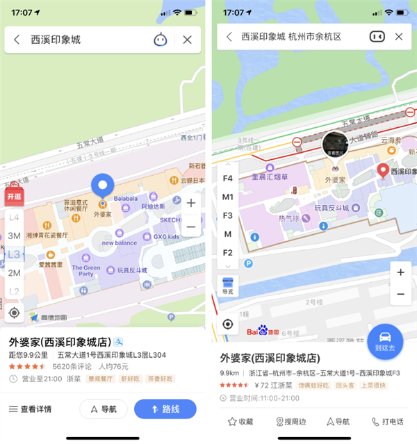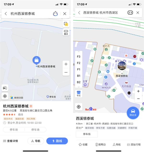 高德地图(左)和百度地图(右)对于西溪银泰城的室内规划支持程度