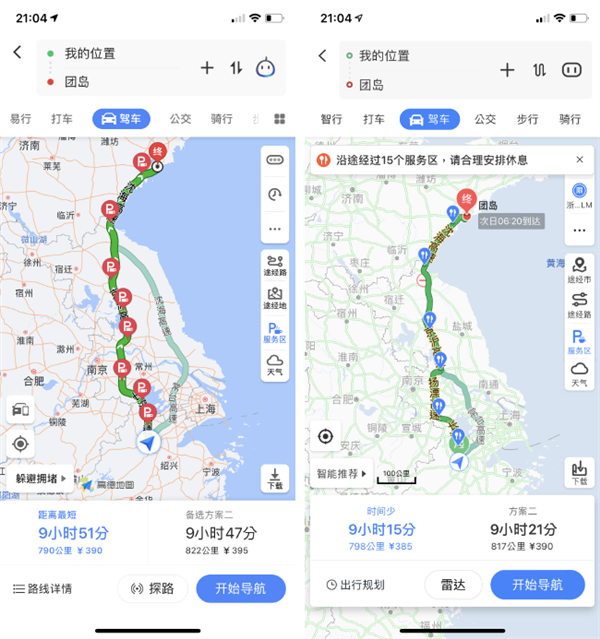 高德地图(左)和百度地图(右)将近 10 小时的自驾路线规划