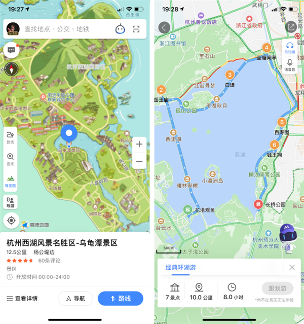 两款 App 对于旅游模式的讲解略有差别,高德的导游模式和导览图,更像是一张贴身的旅游地图,你可以直接使用 App 查看完全标注好的类似于传统纸质的景点专属地图,适合喜欢自由掌控游玩先后顺序的用户。