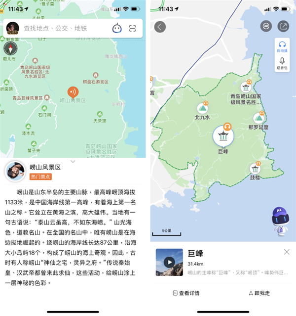 对于青岛而言,高德地图(左)介绍的景点明显少于百度地图(右)