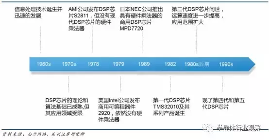 世界上第一个单片 DSP 芯片应当是 1978 年 AMI 公司发布的 S2811 , 1979 年美国 Intel 公司发布的商用可编程器件 2920 是 DSP 芯片的一个主要里程碑。这两种芯片内部都没有现代 DSP 芯片所必须有的单周期乘法器。 1980 年,日本 NEC 公司推出的 μ P D7720 是第一个具有乘法器的商用 DSP 芯片。