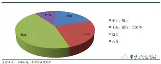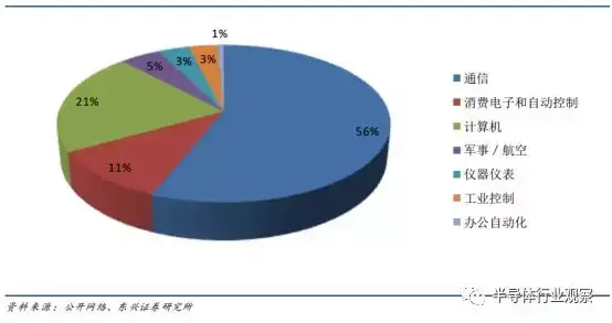 应用 DSP 的领域较多, 未来新应用领域有望层出不穷。 根据美国的权威资讯公司统计,目前 DSP 芯片在市场上应用最多的是通信领域, 占 56.1%;其次是计算机领域,占 21.16%;消费电子和自动控制占 10.69%;军事/航空占 4.59%;仪器仪表占 3.5%;工业控制占 3.31%;办公自动化占 0.65%。