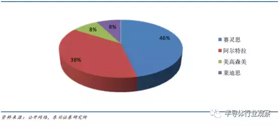 国际 FPGA 市场被四大巨头垄断, 分别是赛灵思、阿尔特拉、美高森美以及莱迪思。阿尔特拉和赛灵思是 FPGA 的发明者,其中阿尔特拉于 1983 年发明世界上第一款可编程逻辑器件,赛灵思于 1985 年公司推出的全球第一款 FPGA 产品 XC2064。 根据2017 年公司财务数据统计,赛灵思营收 23.49 亿美元, 阿尔特拉(被英特尔收购)为 19.02 亿美元,美高森美 FPGA 业务为 4.21 亿美元,莱迪思为 3.86 亿美元。 赛灵思和阿尔特拉两家公司几乎占据了整个国际市场的 90%。
