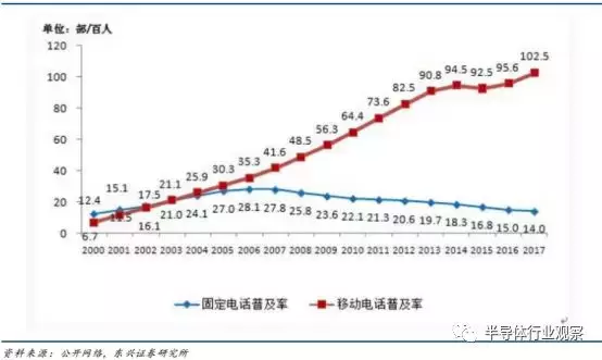 DSP 芯片在智能手机中扮演重要角色。 DSP 芯片可以为移动电话带来更好的语音、音频、图像体验,可以极大提升手机单项功能的能力, 让手机运行速度更快。由于DSP 具有强大的计算能力,使得移动通信的蜂窝电话迅速崛起,并创造了一批诸如GSM、 CDMA 等全数字蜂窝电话网。同时 DSP 芯片是移动电话等电子产品更新换代的重要决定因素。工信部数据显示, 2017 年,移动电话用户净增 9555 万户,总数达 14.2 亿户,移动电话用户普及率达 102.5 部/百人,比上年提高 6.9 部/百人, 移动电话需求量的稳步上升将引致 DSP 芯片等集成电路的大量需求。