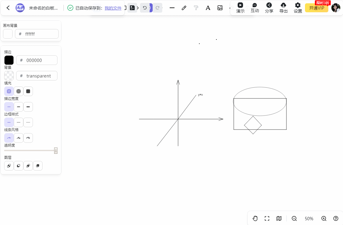 它支持自行插图形状、线条绘制图表,支持多人实时编辑,可以在线发起演讲,并且仅需一个链接就可以轻松分享给别人。