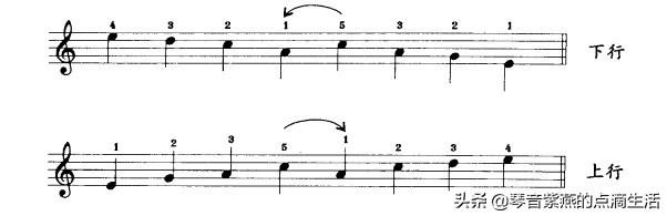 3.跨指法,当高音向低音方向进行时,将2、3、4(5指一般不用)其中的一个手指从拇指上方跨越,以保持旋律的连贯和流畅。谱例如下。