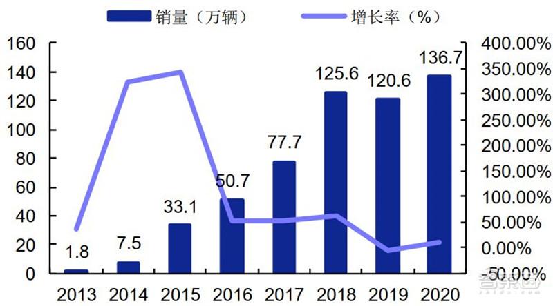 2013-2020 年新能源汽车销量及增长率