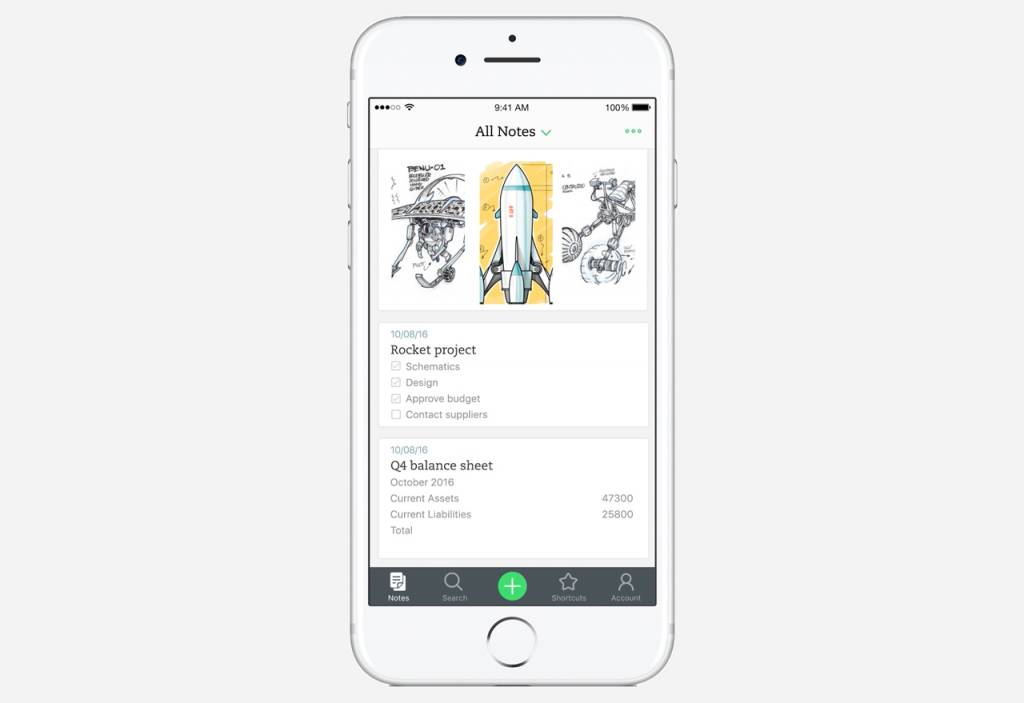 体验上,确实更加简洁快速。打开印象笔记,点击绿色“加号”按钮,即可新建一条笔记。长按该按钮,滑动到不同的选项,还能选择创建录音笔记、图片笔记(扫描名片、白板和收据等)以及设置提醒。