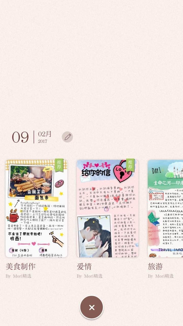 当然,这款产品还兼顾社交功能,旅游、美食、搭配、爱情等不同的主题提供好了模板,你需要做的只是把自己的内容替换进去。在手账社区中,你可以看到其他用户公开的手账作品,如果遇到喜欢的风格,Mori 支持直接采用其他用户的手账格式。