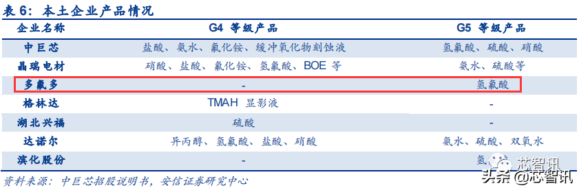 据不完全统计,我国电子级氢氟酸生产厂家有11家左右,但是能够达到半导体所用G4级及以上的企业仅多氟多、中巨芯(原巨化股份)、滨化股份、兴发集团四家左右。而能够供应12英寸晶圆使用需求的超净高纯电子级氢氟酸,即G5级别(UP-SSS)电子级氢氟酸的,目前似乎只有多氟多一家。