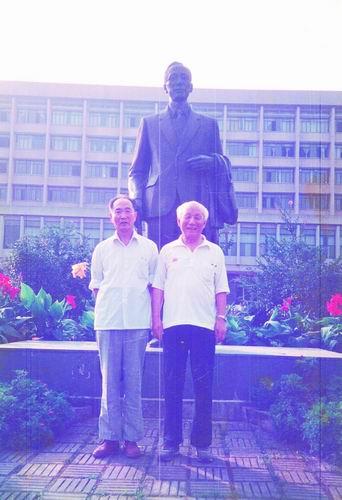 1989年9月,钱令希应邀赴浙大讲学时与夏志斌(左)在老校长竺可桢铜像前合影。
