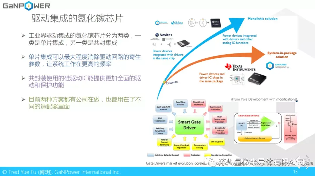 这里介绍一下驱动集成的氮化镓芯片。前面提到过,工业界驱动集成的氮化镓芯片分为两类,一类是单片集成,一类则是共封集成。单片集成以Navitas为代表,可以最大程度的消除驱动回路的寄生参数,让系统工作在更高的频率,这也使得一些兆赫兹频率的应用成为可能。共封装使用的是硅驱动IC加上氮化镓功率器件。因为硅驱动IC非常成熟,共封装能提供全面的驱动和保护功能。共封装的代表公司是德州仪器和Power Integrations