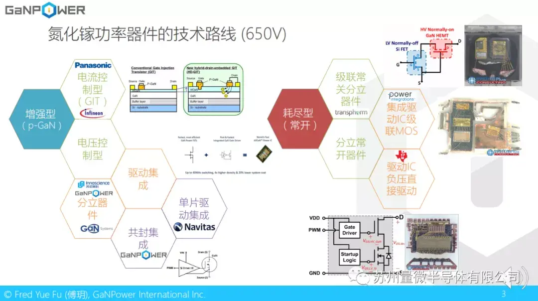 再让我们来看一下650V氮化镓功率器件的技术路线。为什么要是650V呢?因为对于很多电源领域的应用,凡是需要接入220V市电的,母线电容上的电压在输入交流电压整流以后得到大约400V直流电压,再加上电压尖峰和部分拓扑结构应用中副边反射回来的电压,650V就成了一个标准的电压要求。当然氮化镓也有很多中低电压的应用,在这里就不详述了。前面我们已经讲过,氮化镓器件分为增强型和耗尽型两大类。目前主流的增强型器件使用的是一种叫做P-GaN的工艺结构,这种工艺结构带来两类技术路线。一类是以松下和英飞凌为代表的电流控制型。所谓电流控制,指的是门级驱动使用电流,而不是电压来控制。另外一类则是和硅MOS管以及碳化硅MOS管一样,使用门级电压驱动。这里我们主要讲电压驱动型。在电压驱动型里面,又分为分立器件和驱动集成芯片。分立驱动就是只是功率器件,驱动需要外接。驱动集成芯片是芯片里面包含氮化镓功率器件和驱动IC。驱动集成分为共封装和单片集成。其中共封装指的是使用成熟的硅驱动IC和氮化镓功率器件合封在一个封装里面,单片驱动集成是指使用氮化镓工艺同时将驱动IC和功率器件集成在一块芯片里面。耗尽型器件分为级联常关器件和分立常开器件。其中级联常关器件以Transphorm为代表。Power Integration采用的是在蓝宝石衬底上面长氮化镓,同时集成原边驱动,控制以及副边的驱动。使用蓝宝石衬底做氮化镓功率器件的好处是成本较低,但因为蓝宝石本身的导热性很差,大功率应用会有困难。另外一个使用常开型器件集成驱动的典型代表是TI, 与传统级联方式不同,德州仪器使用的是一种叫做直接负压驱动耗尽型氮化镓的方式。门级驱动直接接到氮化镓而不是级联方式中的低压MOS管。