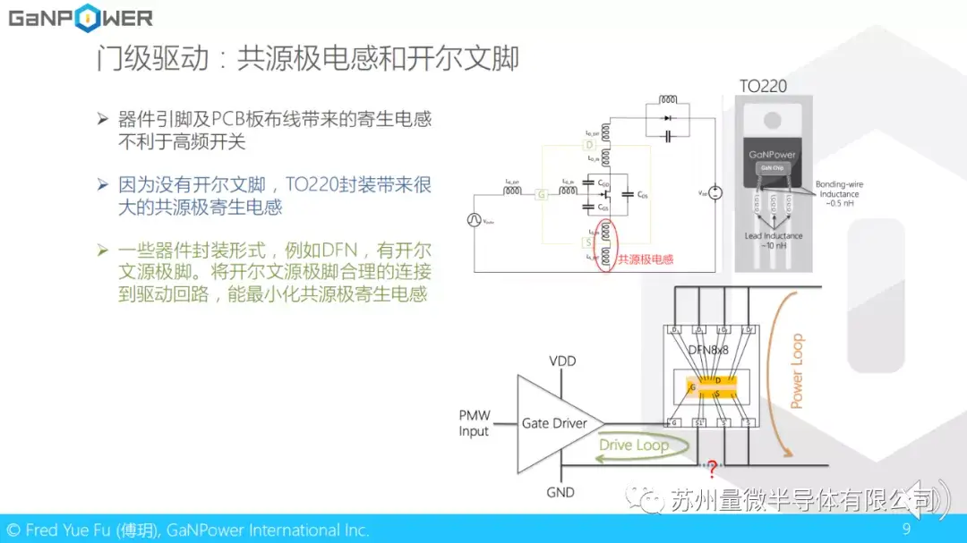 传统上硅功率器件大量使用直插引脚封装,例如TO220。这对于频率不算太高,di/dt不算太大的应用而言没有问题。然而氮化镓常常被使用在高频,高di/dt的环境中。这就需要考虑因为封装引脚带来的寄生电感的问题了。我们知道,如果驱动回路和功率回路共用一个源极引脚,会有一个共源极电感的问题。较高的di/dt会在源极电感上面感应出一个电压。在器件开通的过程中,产生上正下负的电压,阻碍器件开通。在器件关断的过程中,感应出一个下正上负的电压,阻碍器件关断。这样不仅会减慢器件的开关过程,甚至会使器件误导通。一般氮化镓比较常用的封装是DFN封装,并有开尔文脚,将功率回路和驱动回路分开。这里面有个特例就是LLC软开关拓扑。因为LLC的di/dt较小,所以TO220也可以用在LLC电路拓扑应用里面。