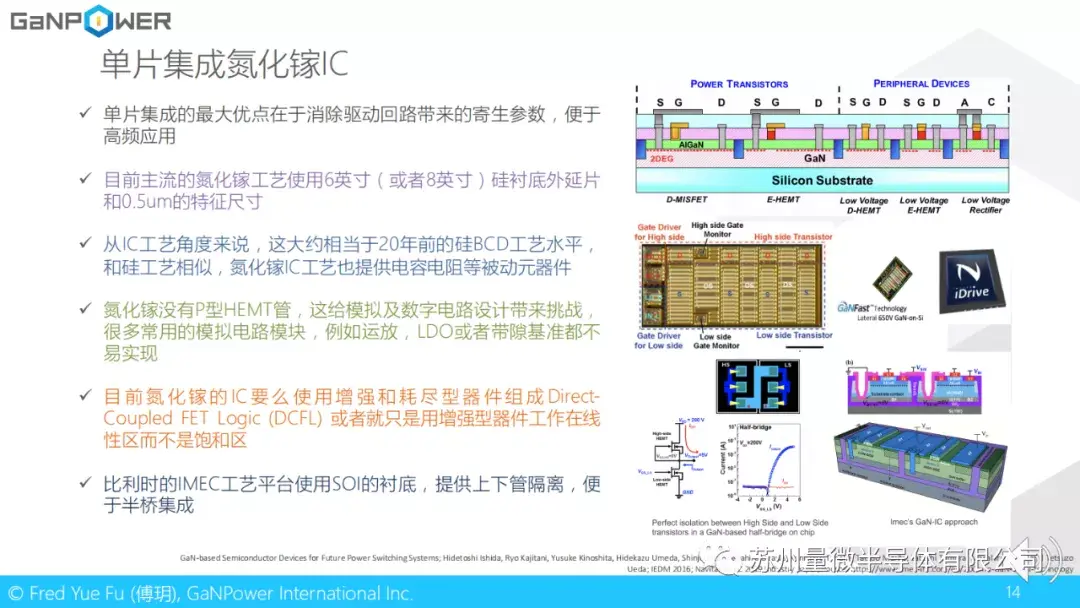 单片集成氮化镓IC的最大优点在于消除驱动回路的寄生参数。目前主流氮化镓工艺使用6寸或者8寸的硅衬底外延片,特征尺寸在0.5um左右。从IC工艺角度而言,这大致相当于20年前硅BCD smart power IC工艺水平。氮化镓IC工艺也可以提供诸如电容,电阻等被动元器件,但却没有P型HEMT管。这给模拟及数字电路设计带来挑战,很多常用的模拟电路模块,例如运放,LDO或者带隙基准都不易实现。比利时的IMEC氮化镓工艺平台使用SOI衬底,这样做可以方便半桥电路的上下管隔离