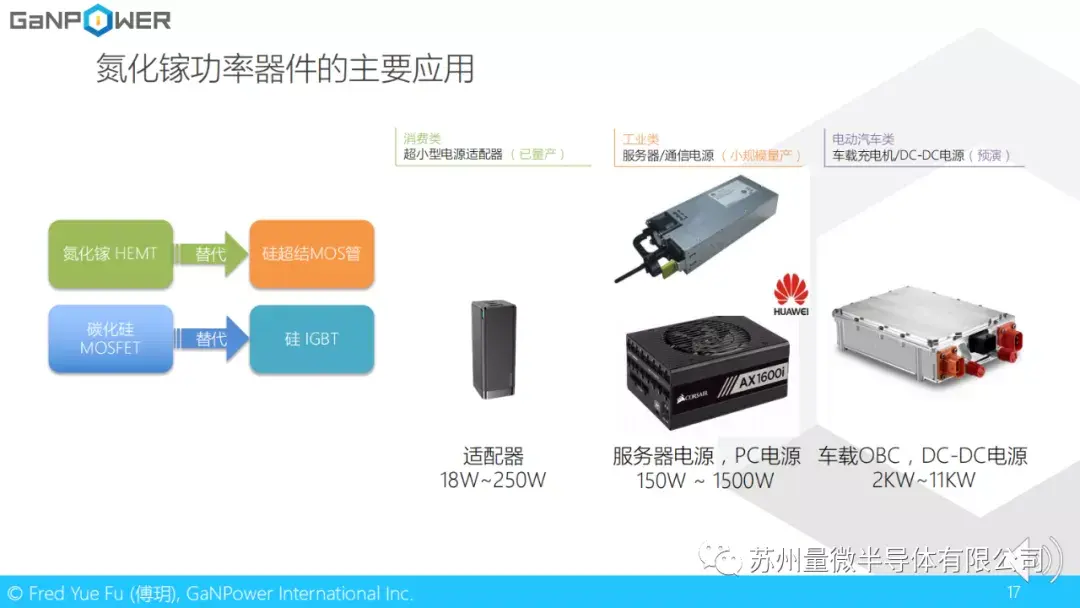 我们知道,氮化镓功率器件会逐渐取代硅超结MOS管,而碳化硅MOS管会逐步取代硅的IGBT。就氮化镓应用层面来讲,可以分为消费类,工业类和电动汽车三大类。其中消费类,特别是氮化镓超小型电源适配器已经开始量产。工业类有小规模量产,汽车类应用还需要一些时间。目前还处在预演阶段。
