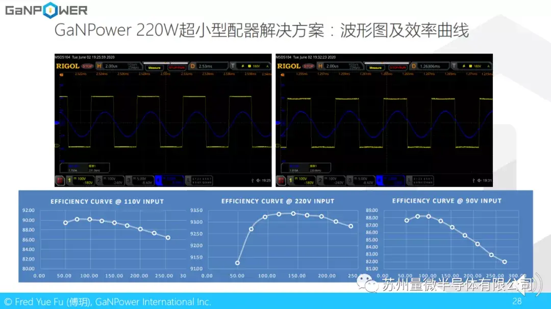 这里是我们220W适配器解决方案。设计非常紧凑,可以看到长度不到名片的大小。效率也可到94%。这个是包含PFC和DC/DC部分的总效率。