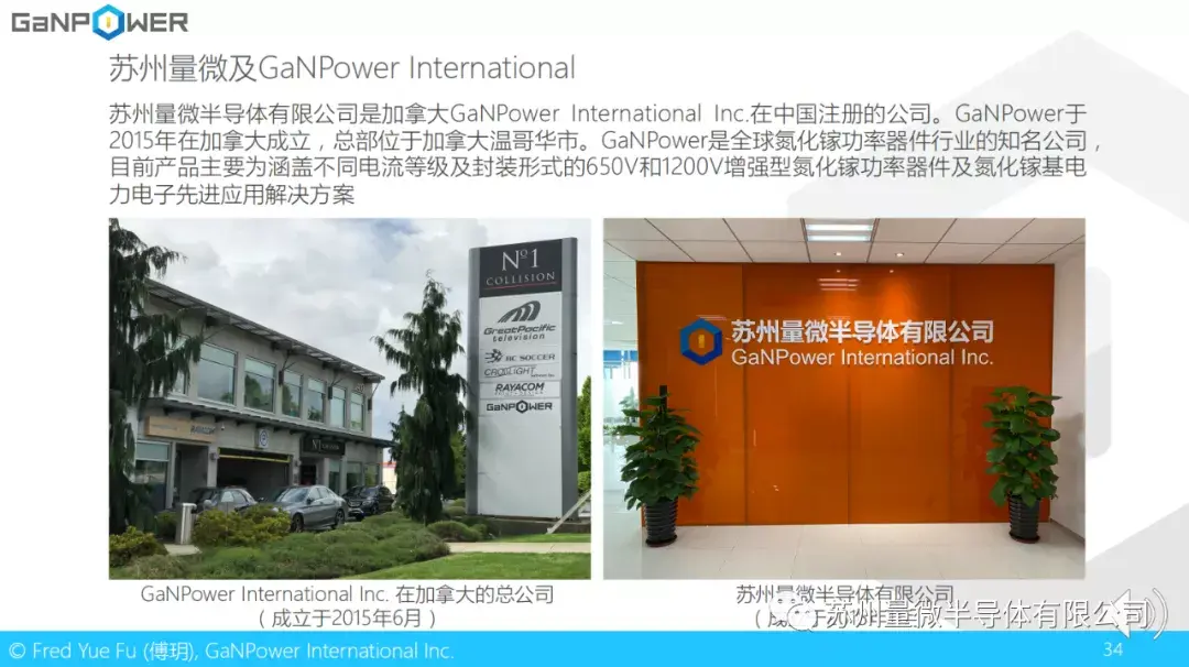 这里简单介绍一下我们公司。苏州量微半导体有限公司是加拿大GaNPower International Inc.在中国注册的公司。GaNPower于2015年在加拿大成立,总部位于加拿大温哥华市。GaNPower是全球氮化镓功率器件行业的知名公司,目前产品主要为涵盖不同电流等级及封装形式的650V和1200V增强型氮化镓功率器件及氮化镓基电力电子先进应用解决方案