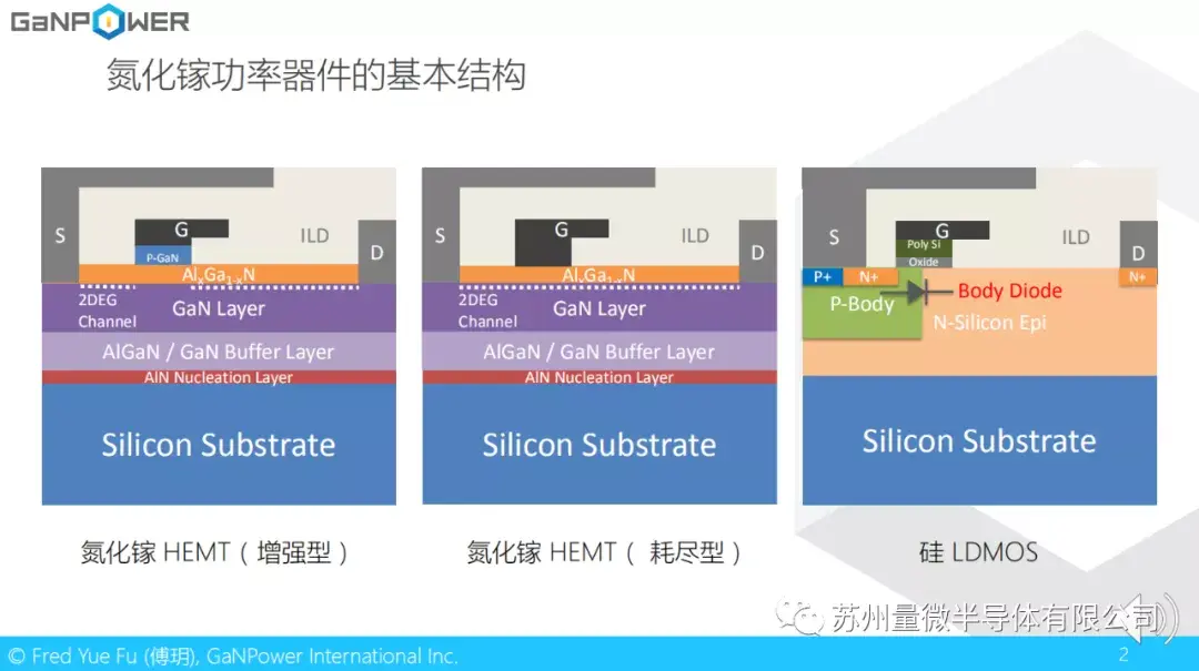 首先让我们来看一下氮化镓功率器件的结构。我们可以看到,氮化镓功率器件和硅LDMOS看起来很像。从结构上讲,氮化镓器件和硅LDMOS都是横向器件。也就是说,他们的源极,门级和漏极都在芯片的上表面。同时为了让电场分布更加均匀,他们都使用了场板的设计。当然,不同之处在于氮化镓是化合物半导体外延,通过异质结形成高电子迁移率的二维电子气沟道。而硅LDMOS是硅外延层上进行掺杂形成P-N结。同时我们知道,氮化镓功率器件分为增强型(E-Mode)和耗尽型(D-Mode)两种。增强型是常关的器件,而耗尽型则是常开的器件。在电力电子应用中,常开的器件会带来使用上的不便和安全方面的问题。因此实际应用中的氮化镓功率器件都需要是常关型的器件。