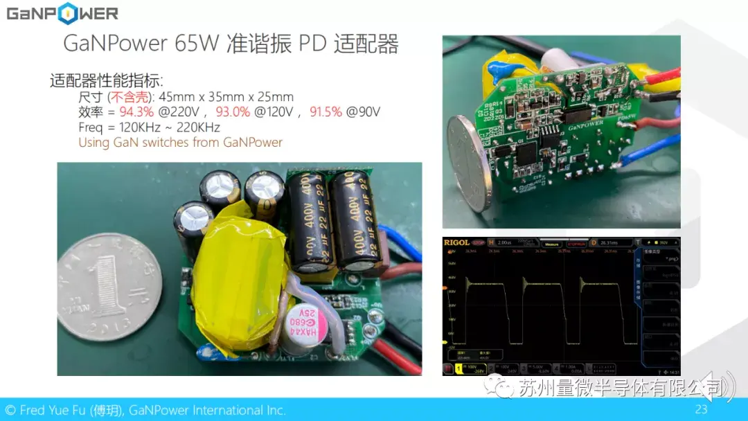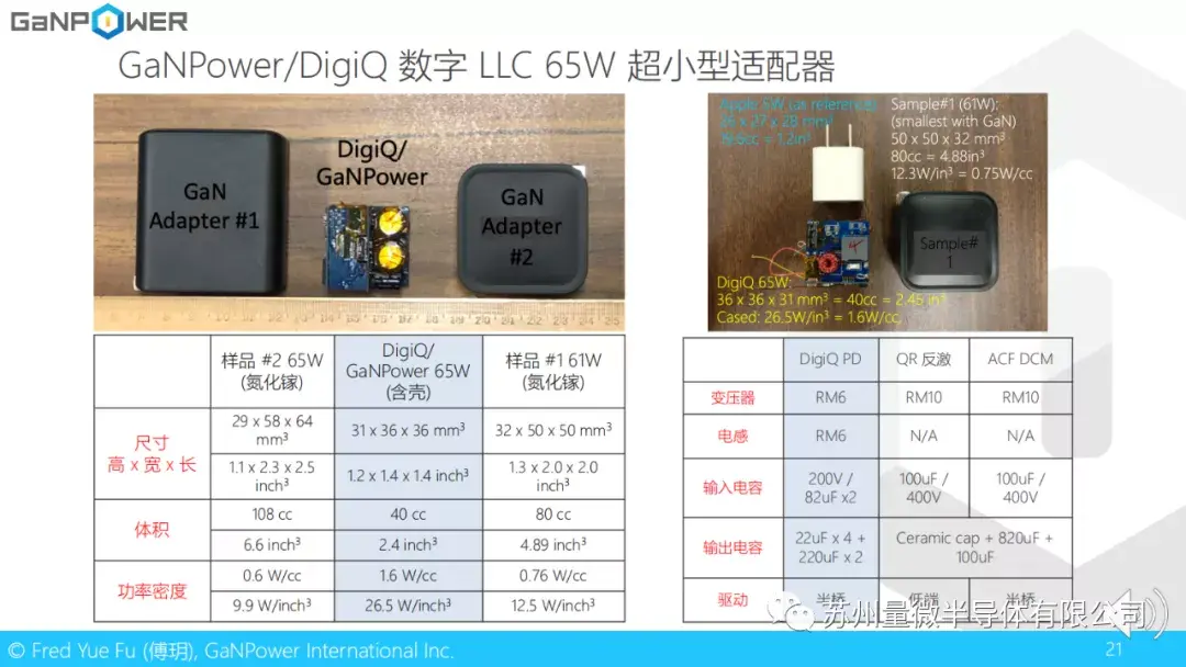 这里是一些更具体的参数,在这里我就不再详述。我们的功率密度是目前氮化镓QR准谐振反激方案的两倍不止。右上图可以看到我们的65W适配器甚至看起来和苹果的5W适配器差不多!