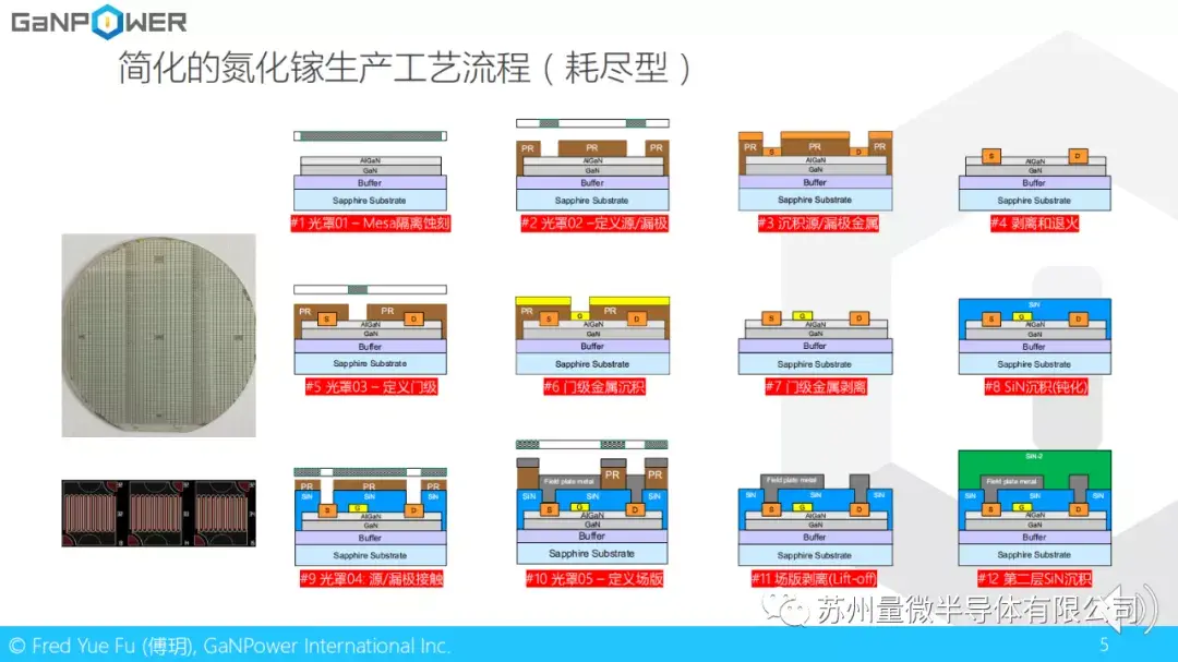 这里有一个简化的耗尽型氮化镓生产工艺流程介绍。左边是GaNPower在4年前使用蓝宝石衬底做的耗尽型氮化镓器件的两寸晶圆,当然现在GaNPower已经不再做耗尽型器件,而专注于硅衬底的增强型器件。我们看到第一步是做mesa隔离蚀刻;第二步是定义源极和漏极;第三步是沉积源漏极金属;第四步是剥离和退火;第五步是定义门级;第六步是门级金属沉积;第七步是门级金属剥离;第八步是SiN氮化物沉积钝化;第九步是源极漏极的接触开口;第十步是定义场板;第十一步是场板剥离(Lift-off);第十二步是第二层氮化物沉积。