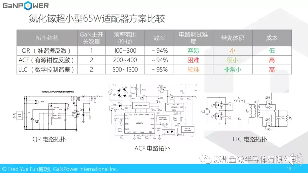 这里比较的是氮化镓超小型65W适配器的三种方案。第一种是QR (准谐振反激),第二种是ACF(有源钳位反激),第三种是LLC数字控制谐振拓扑。这张表比较了三种方案的工作频率范围,效率,电路调试难度,体积以及成本。如果优先考虑成本,则QR (准谐振反激)为最佳。如果优先考虑体积和效率,则LLC数字控制谐振最佳。目前GaNPower/DigiQ是唯一一家提供65W LLC方案的氮化镓器件供应商