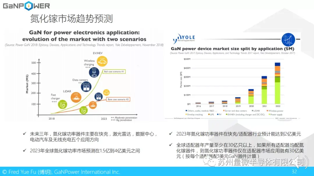前面一直在谈技术,这里简单说一下市场。这里有法国悠乐咨询公司的两张预测图。预计未来三年,氮化镓功率器件主要有快充,激光雷达,数据中心,电动汽车和无线充电五个应用方向。2023年全球氮化镓功率市场预测在1.5亿到4亿美元之间。同时呢,2023年氮化镓功率器件在快充/适配器行业预计能达到2亿美元。但我个人认为这个预测可能高估了在汽车方面的应用,同时低估了在适配器上的应用。全球适配器年产量至少在30亿只以上,如果未来所有适配器均配氮化镓器件,按每个适配器配1美元GaN器件计算的话),氮化镓功率器件仅在适配器市场应用就可达30亿美元。