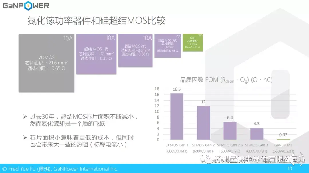 我们知道,芯片面积和芯片成本正相关。过去三十年,硅MOS管的技术得到很大的进步。从普通的VDMOS,到超结MOS, 硅器件本身成本也在降低,受制于材料特性,硅功率器件芯片面积和成本已经很难在下降,然而氮化镓却是一个质的飞跃。我们也看到相同的电压和电流标称值,氮化镓的Rdson会小很多。这其中的原因前面已经有提到,是跟氮化镓因为芯片面积小而带来更大的结壳热阻有关。如果我们看右下角的这张图,它反应的是品质因素(Rdson*Qg),同样的电压和类似的通态电阻,氮化镓的FOM要小很多。这意味着从理论上讲,器件的导通和开关损耗会小很多。