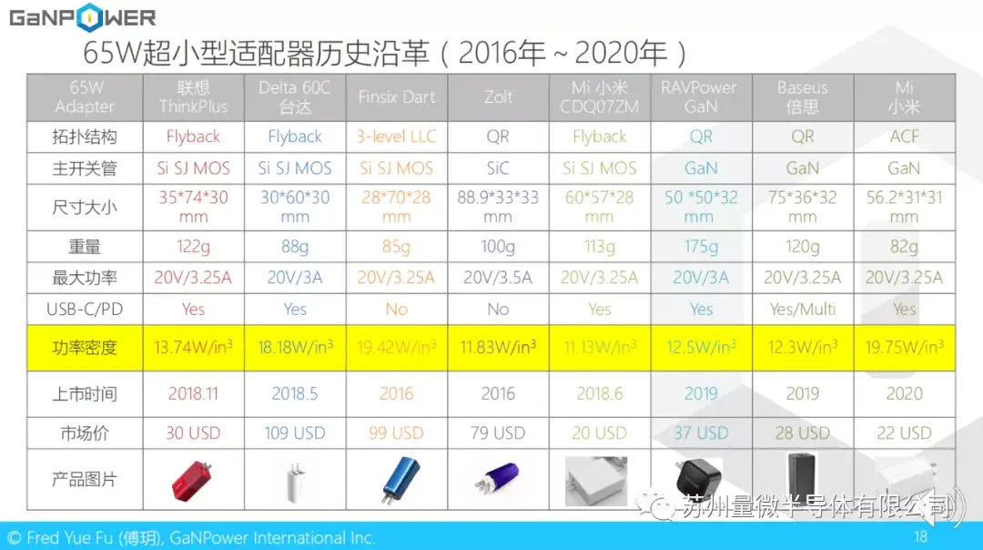 这里是65W超小型适配器的历史沿革。我们看到过去4年里面,有很多不同的方案呈现出来。包括三电平LLC,有源钳位反激等。甚至有公司用碳化硅做主开关管。当然成本会很高。高亮的部分为功率密度比较。我们看到目前能做到的最高的功率密度是小米/纳维的ACF+平板变压器方案。但即使如此,功率密度也没有超过20W每立方英寸。
