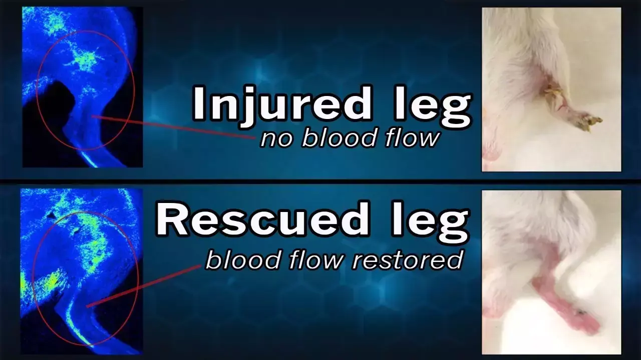 在未经处理的对照组中,小鼠的腿由于缺乏血液流动而迅速坏死,而使用 TNT 技术治疗的小鼠后腿则在几周之内长出了能够正常工作的血管。三周过后,这些小鼠并没有接受除了 TNT 之外的其它治疗,但是它们已经长出了功能健全的血管,受伤的四肢也几乎痊愈。