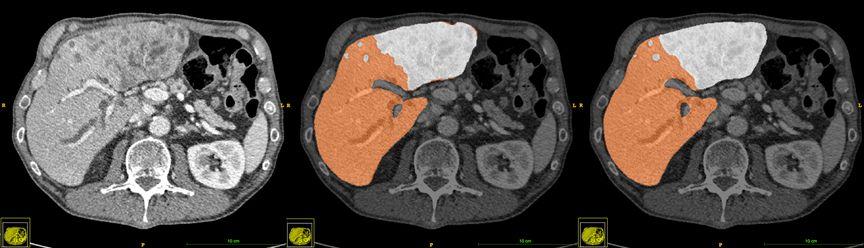 ▲图1-8 肝脏及结节分割技术,从左至右:CT原始影像、真实结果、算法结果