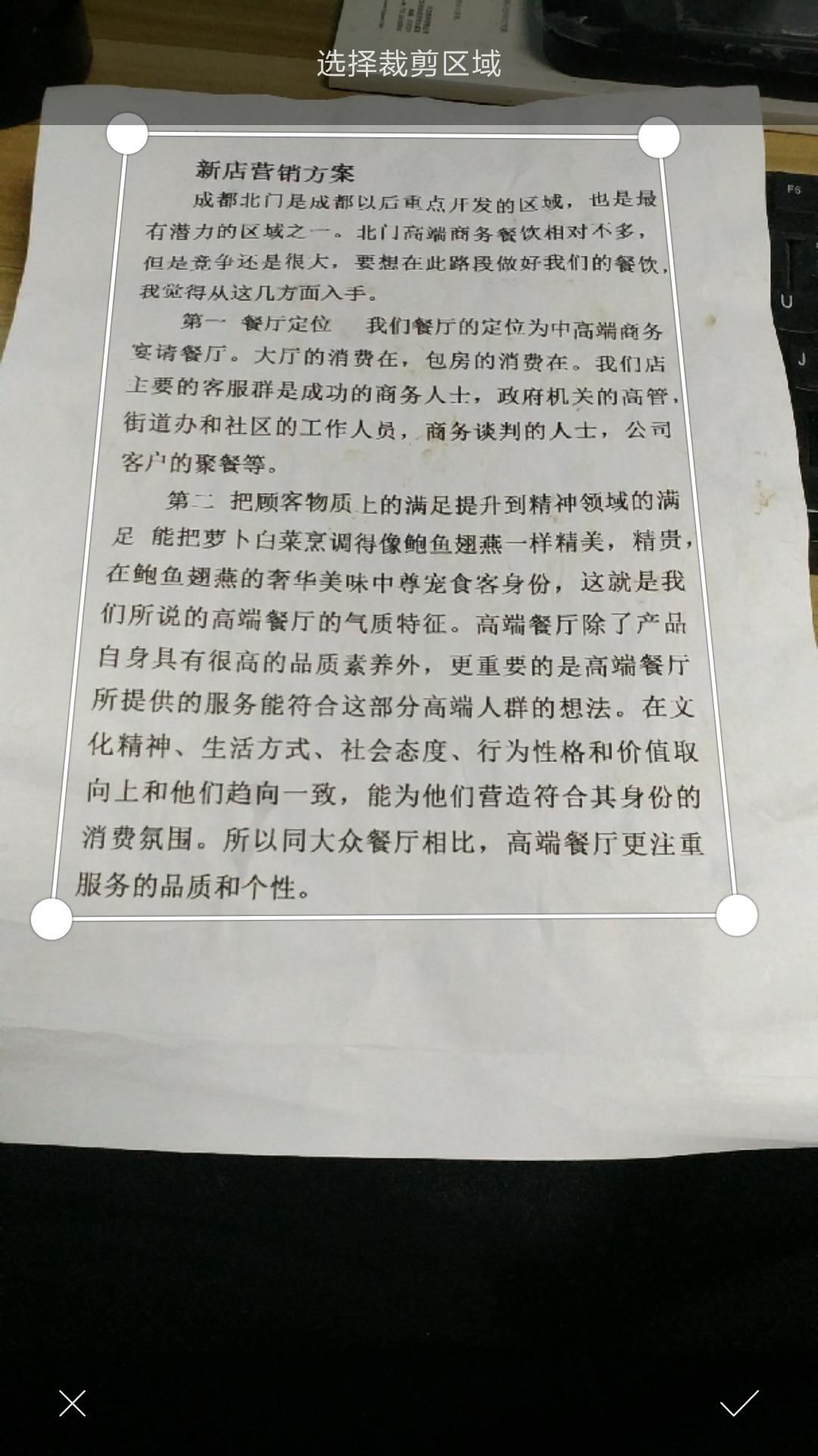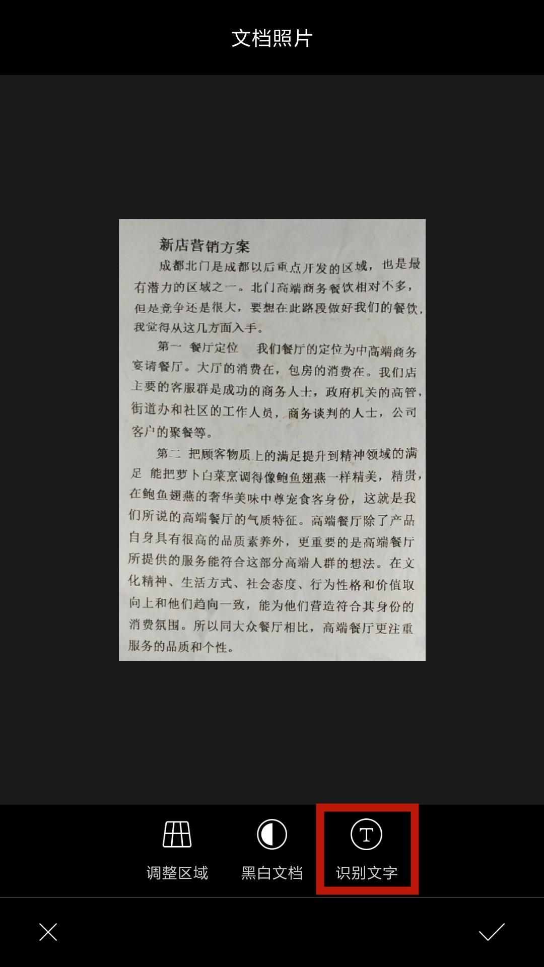 按下快门之后,我们修整、裁剪一下扫描区域,点击「识别文字」按钮。