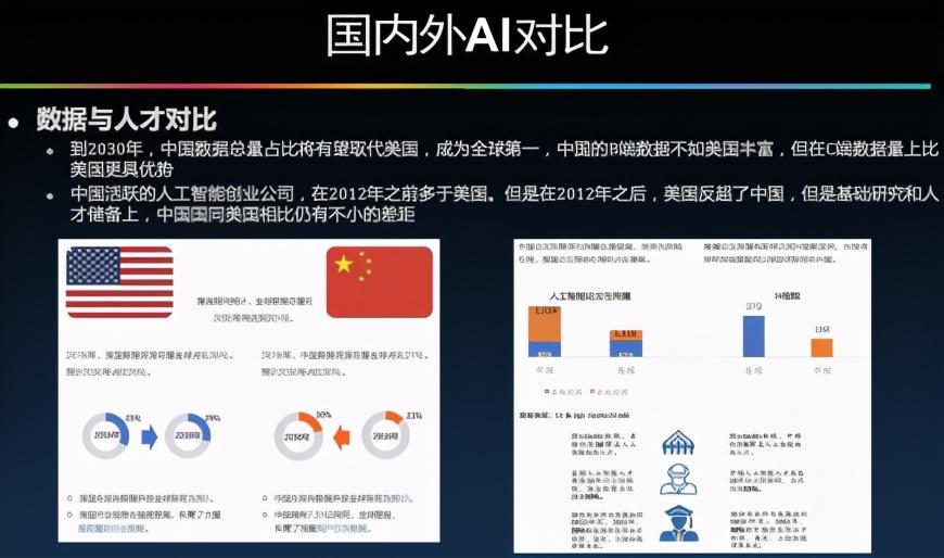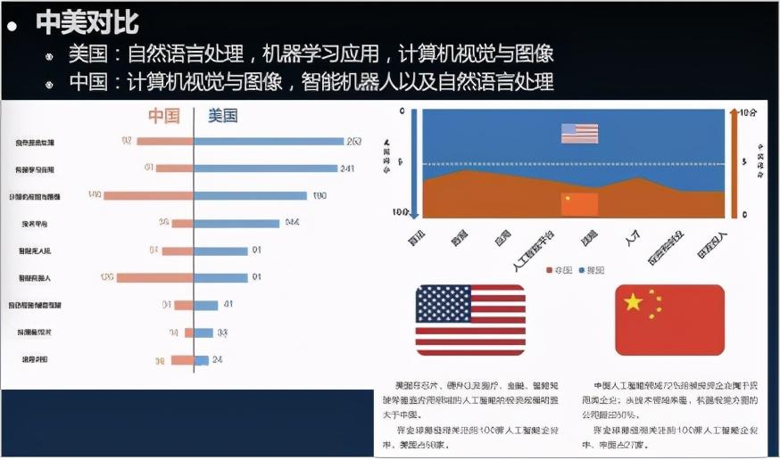 第四次工业革命到来之前,中国、美国、欧盟、英国、日本,都围绕着深度学习、超级算力、工业软件、智能系统这几方面做了深入布局,其中,最有代表性的就是中国和美国。从中、美对比来看,美国在自然语言处理、机器学习、计算机视觉领域非常强大,而中国更多在应用与计算机视觉和图像、机器人和NLP自然语言处理领域有更多积累。