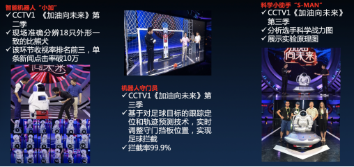 我所带领研究团队的一些技术成果,也在央视一些节目中进行了展示。在央视《加油!向未来》节目中,我们团队的机器人守门员挡住了130公里时速射过来的足球。130公里时速射过来的足球是什么概念?如果是真人守门员,这威力足以把人打穿。这里的上限在于电机的响应速度,从这一点看,机器有时候比人要厉害,如果用机器人守门员的话,中国足球的大门就非常安全了。