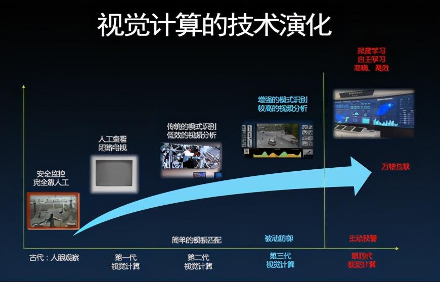 从2012年开始,迎来了第四代视觉技术阶段,通过深度学习网络来模拟人的感知过程,对视觉的理解从被动防御变为了主动预警,视觉识别应用处在落地关键期。