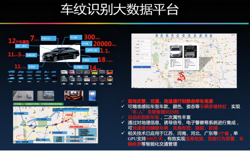 识别车是否套牌是应用最广的,通过对类似人类指纹一样“车纹”的身份识别,可以快速地查找到真牌和假牌。可能拍一张照片,就能了解这辆车的载重、排放是多少。通过一个摄像头,就可以进行多种角度车的属性、身份、行为的识别,知道每个车的行为轨迹。