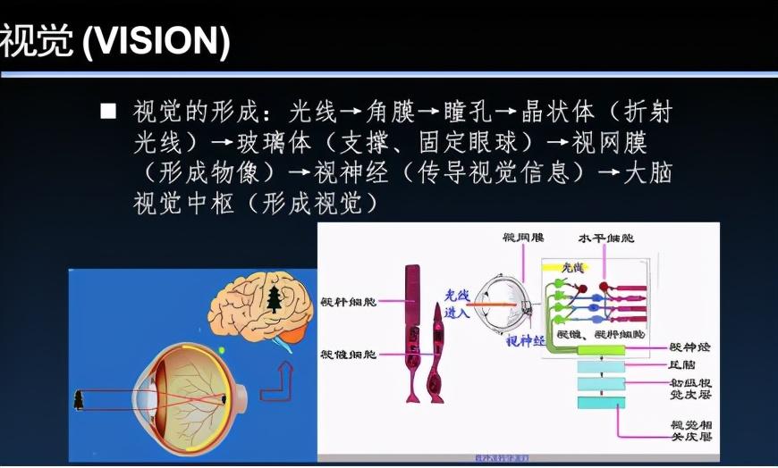 远在寒武纪时期,一个生命体进化出了具有视觉感知的细胞,能感受很近范围的太阳光,出现了最早的视力系统。视觉产生的原理是小孔成像:光线通过视网膜映射在我们的瞳孔中,成为一个倒立的像,再通过视神经传导到大脑的视觉神经中枢,视觉神经中枢再把它正过来,就是视觉成像。