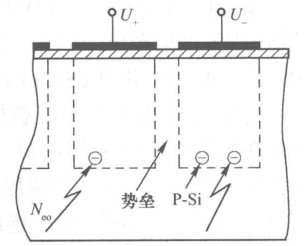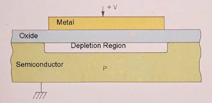 当向SiO表面的电极加正偏压时,P型硅衬底中形成耗尽区(势阱),耗尽区的深度随正偏压升高而加大。其中的少数载流子(电子)被吸收到最高正偏压电极下的区域内,形成电荷包(势阱)。对于N型硅衬底的CCD器件,电极加正偏压时,少数载流子为空穴。