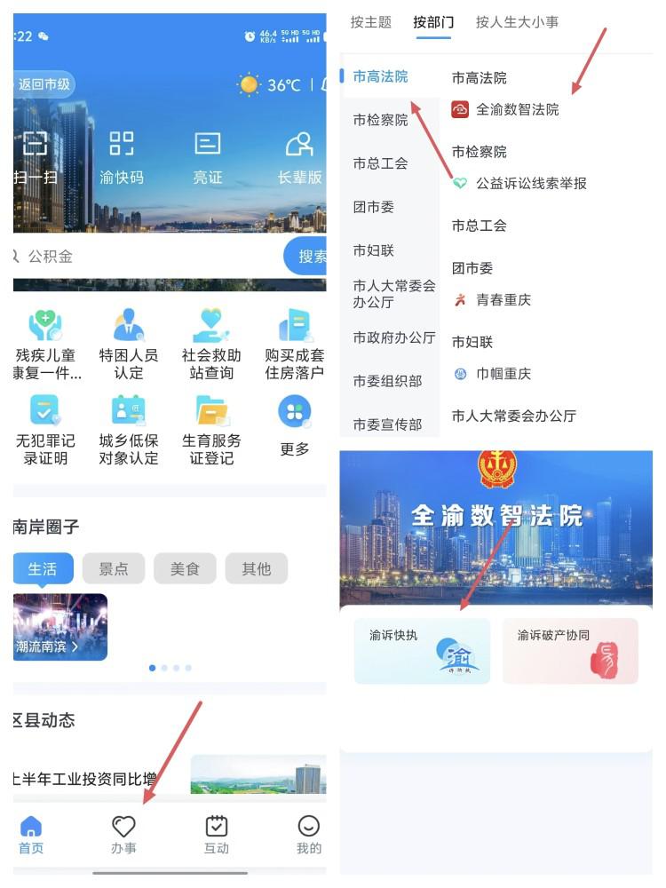 途径二:②选择“渝快办”首页下方“办事”,选择“按部门”服务,选择“市高法院”,找到“全渝数智法院”后点击进入“渝诉快执”。