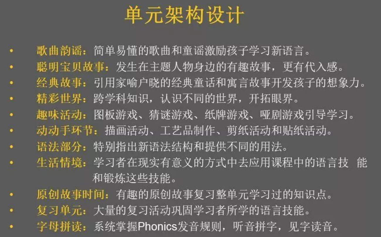 此课程通过丰富的对话、文本、游戏、歌曲,全面提升 “ 听,说,读,写” 四大技能。