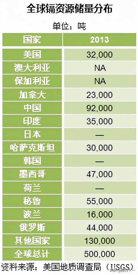 根据美国地质调查局(USGS)2014年公布的数据显示,截止2013年全球镉储量总量为500,000吨,目前中国是各国当中镉储量最为丰富的国家,以92,000吨镉储量占全球总量的18.4%。其他蕴藏镉资源较丰富的国家有:秘鲁、墨西哥、印度、俄罗斯、美国等。【中国镉资源储量及分布情况】