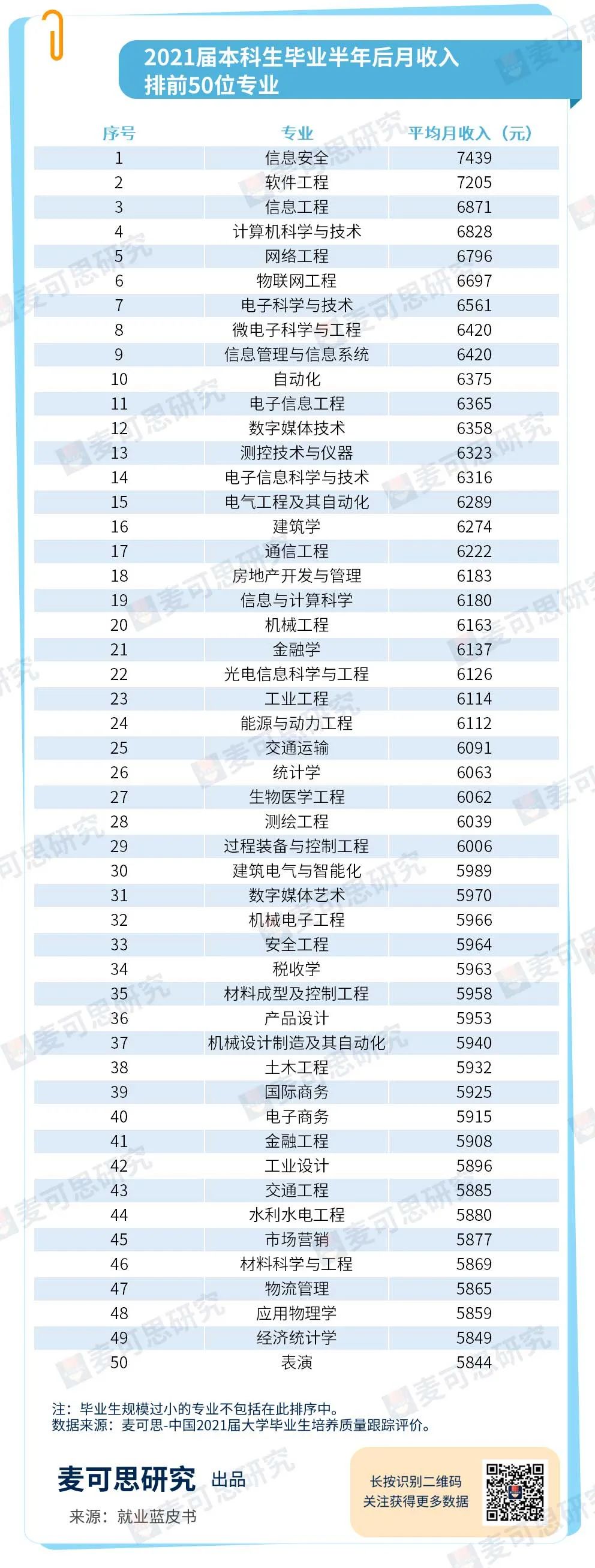 根据麦可思发布的《2022年中国本科生就业报告》,2021届本科生毕业半年后的平均月收入为5833元 ,而本科生起薪较高的前50位专业为:根据上表,起薪较高的50个专业均超过了本科平均水平(5833元),排在末位的表演 则以5844元低空过线。