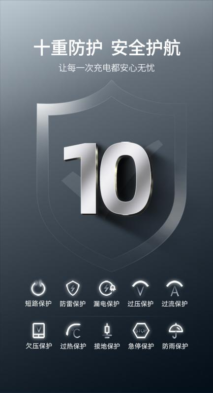极致的安全保障安全是星云充电桩的核心优势之一。它具备十重保护功能,包括短路保护、防雷保护、漏电保护、过压保护、过流保护、欠压保护、过热保护、接地保护、急停保护、防雨保护等。每一项保护功能都如同一位忠诚的卫士,时刻守护着汽车充电的安全。