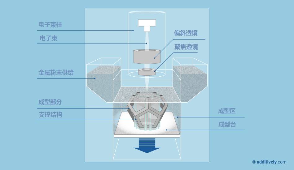 电子束熔融的过程很像激光熔融,只是热源由激光换成电子束。首先机器将一层很薄的金属粉末平铺在成型台上,被电子束熔化后,成型台下降一定程度以便下一层金属粉末可以覆盖至顶层,再被电子束在所选择的部分熔化。这一过程反复进行,直至最终成品。