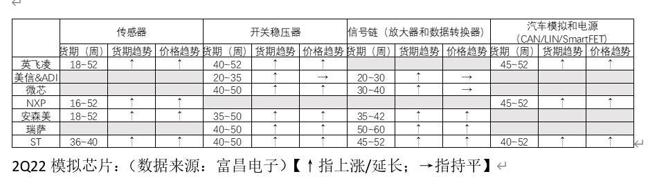 根据富满电子的数据,今年二季度,汽车模拟芯片的交货周期有拉长趋势,价格趋势向上。