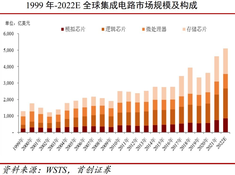 根据WSTS数据,2021年全球集成电路市场规模达4630.02亿美元,模拟芯片占比16.01%。