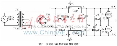 直流稳压电路的仿真测试原理图如图1所示,经测试:当输入220 V、50 Hz的交流电压时,输出端获得的电压为+5.01 V和-5.02 V,与理论值5 V的误差分别为0.2%和0.4%,能较好地满足常用数字芯片的供电要求。