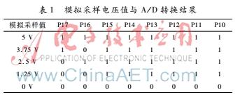 首先将滑动变阻器调至电压表示数为0 V的位置,然后按照硬件测试的步骤,会得到与0 V电压值对应的A/D转换的结果,记录在表1中,重复上述的步骤,分别测出电压表示数为1.25 V、2.5 V、3.75 V和5 V对应的A/D转换的结果,记录在表1中。仿真测试的结果与理论分析结果一致,说明硬件测试的方法和步骤是正确的。