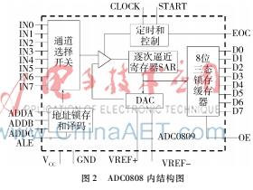 图2ADC0808内结构图ADC0809是数字电路中经典的A/D转换器,具有8路模拟量输入通道,有转换起停控制,模拟输入电压范畴为0~+5 V,转换时间为100 μs,它的内部结构如图2所示。ADC0808的引脚功能描述如下:IN0~IN7为模拟采集通道;ADDA、ADDB和ADDC用于选择8路模拟采样通道的一路;ALE为输入信号用于锁存采样通道,高电平有效;START为输入信号用于启动模数转换,高电平有效;EOC为A/D转换结束信号,高电平表示模数转换结束,低电平表示模数转换正在进行;OE为输入信号,转换结束时,若OE为高电平则允许转换数据从D0~D7输出;CLK为时钟脉冲输入端,要求时钟频率不高于640 kHz;VREF+、VREF-为基准电压输入端,典型值分别为+5 V和0 V;VCC接+5 V电源,GND接地[6]。